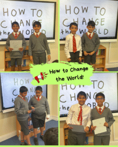 From protecting the environment to promoting equality and kindness, the pupils showed creativity, critical thinking, and impressive confidence in public speaking. The lesson encouraged them to consider how young people can make a difference both locally and globally – taking their ideas from Pinner to the global stage!